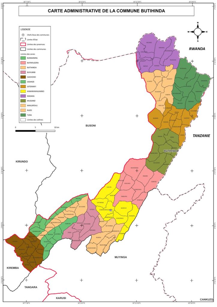 La commune de Butihinda se trouve au Nord Est du Burundi, en province de Buhumuza. Elle est limitée au Nord par le Rwanda, à l’Ouest par les communes Busoni et Kirundo de la province Butanyerera, au Sud-Ouest par la commune de Kiremba, au Sud par la commune Tangara de la province Butanyerera et la commune Muyinga de la province Buhumuza , à l’Est par la République unie de Tanzanie. Elle couvre une superficie de 783,757 km².